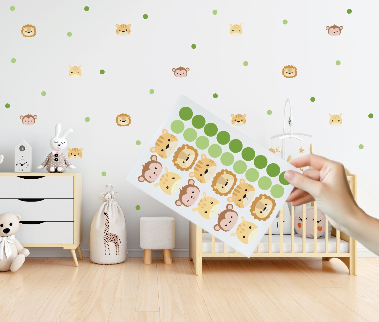 - O kit contem 150 adesivos sendo 60 adesivos de carinha de animais com tamanho 5 x 5 cm + 90 bolinhas tamanhoo 3 x 3 cm.